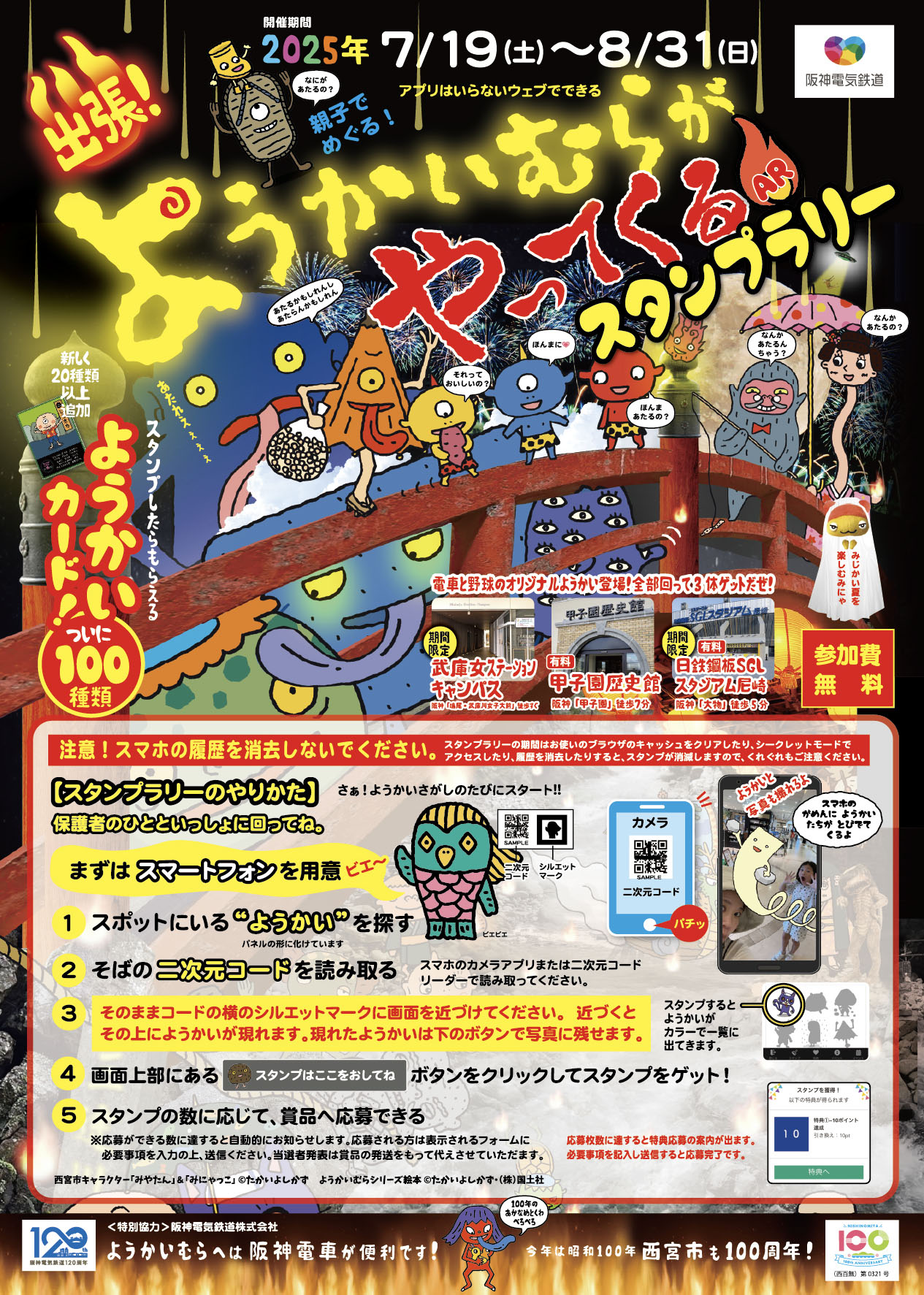 西宮市・尼崎市・宝塚市・伊丹市・芦屋市・神戸市・丹波篠山市・丹波市・西脇市・加東市・加西市・小野市・加古川市・高砂市・福崎町・洲本市・大阪市の一部にまたがる約130 のスポットで開催。今年は西宮市市制100年を記念してようかいカードも100種類登場。99・100体目は一般公募によって決定しました。
